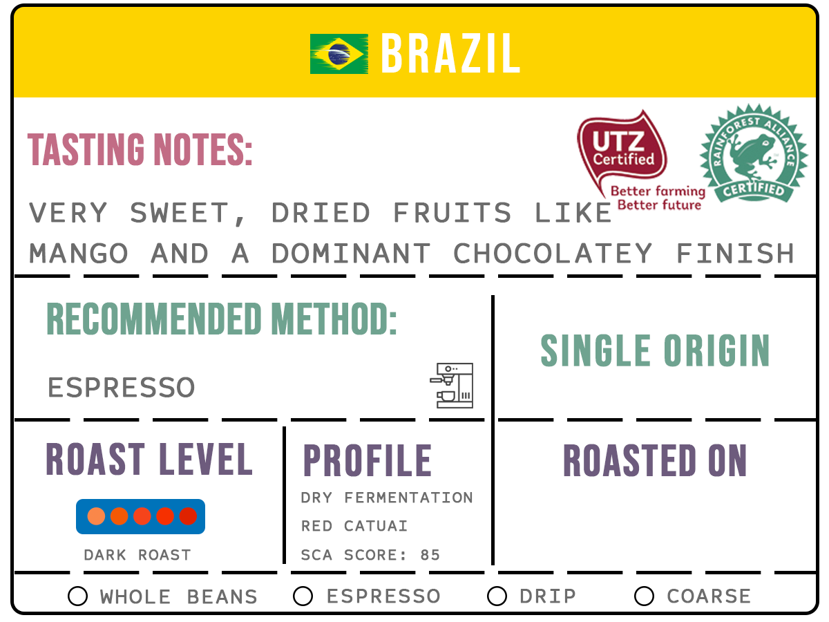 Brazil Espresso Single Origin is a premium coffee designed to deliver a rich and satisfying experience. With tasting notes of dried fruits like mango, a pronounced sweetness, and a dominant chocolatey finish, this coffee offers a perfectly balanced profile. Scoring 85 on the SCA scale, it reflects exceptional quality and craftsmanship, making it an ideal choice for espresso enthusiasts.