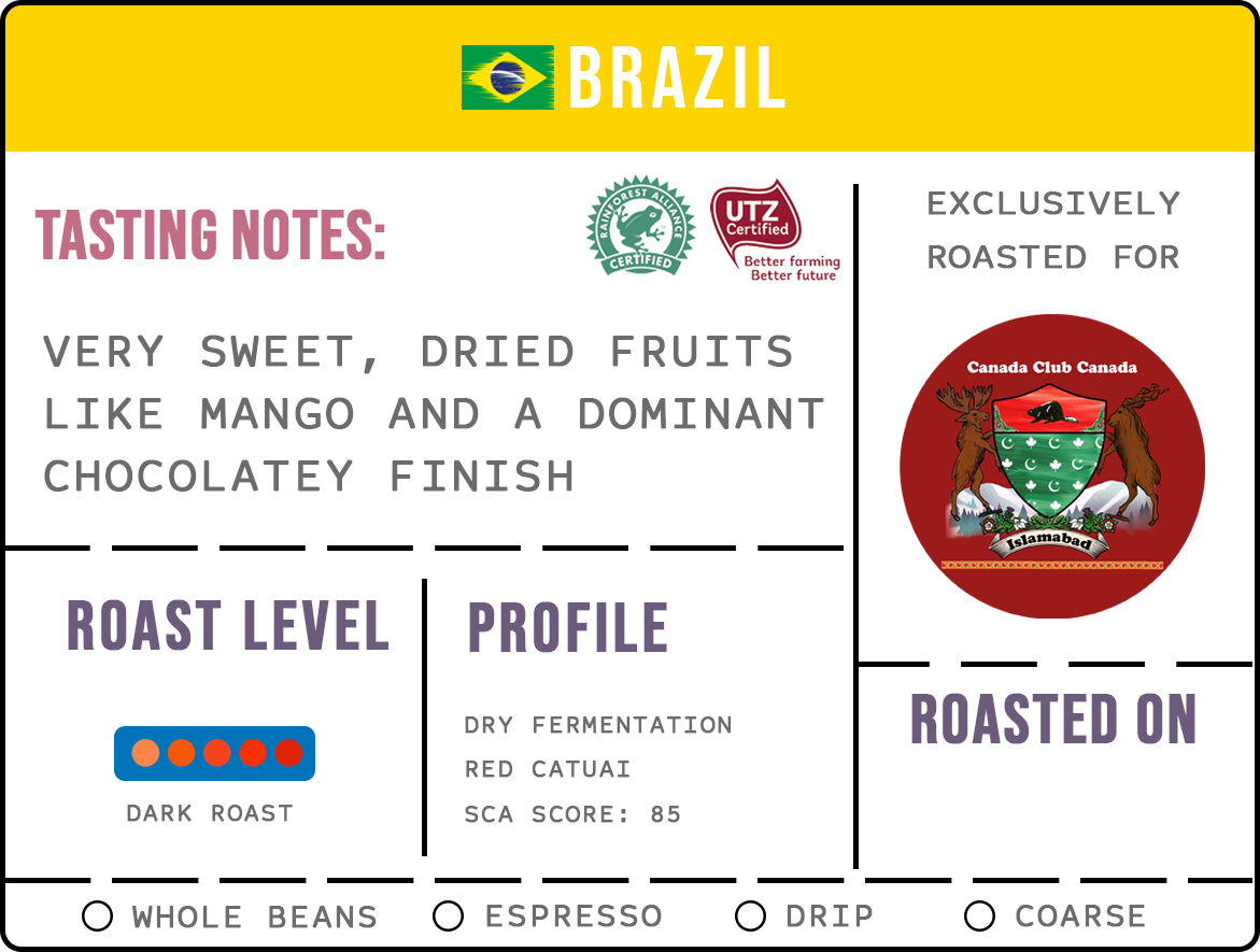 The Brazil Canada Club espresso, a dark roast with a SCA score of 85, has a rich yet balanced taste profile. It has a highly sweet flavor, which is enhanced with vivid dried fruits like mango, which provide a tropical, somewhat sour sweetness. The coffee concludes with a prominent chocolaty note, providing a rich and smooth depth to the whole experience. The dark roast emphasizes these tastes by creating a robust body and complementing the sweetness, resulting in a delicious, well-rounded cup. This coffee, with its complex and harmonious combination of fruitiness and chocolate, is ideal for individuals who want a deeply sweet and tasty espresso with a memorable finish.