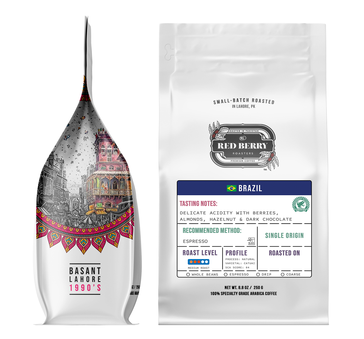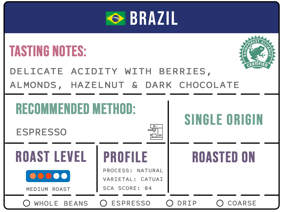 A premium natural process coffee from Brazil, proudly Rainforest Alliance Certified. This medium roast coffee features delicate acidity complemented by tasting notes of berries, almonds, hazelnut, and dark chocolate. Ideal for espresso, it offers a rich and smooth profile, perfect for coffee enthusiasts. Made from the Catuai varietal and scoring 84 on the SCA scale, this single-origin coffee reflects a commitment to quality and sustainability. The label includes space for the roasting date to ensure maximum freshness.
