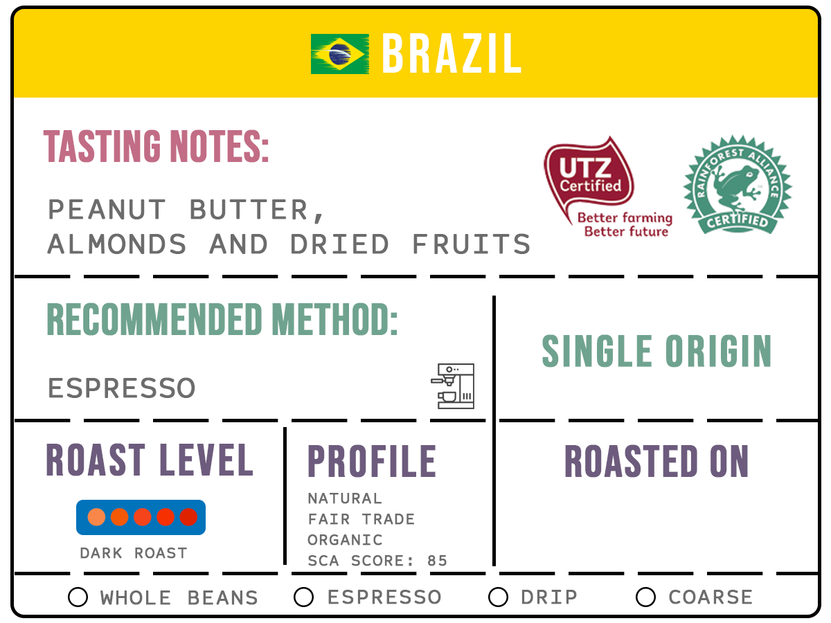 This Brazil espresso single origin dark roast, with an impressive SCA score of 85, offers a rich and nuanced tasting experience. Its flavor profile features delightful notes of peanut butter, almonds, and dried fruits, creating a smooth, nutty base with a hint of natural sweetness. The creamy, roasted peanut butter provides a savory depth, complemented by the subtle, toasty flavor of almonds. Meanwhile, the dried fruits add a touch of sweetness and slight tartness, perfectly balancing the overall richness. The dark roast enhances the body and complexity of the coffee, making it an ideal choice for those who appreciate a full, well-rounded espresso with a blend of nutty and fruity elements.