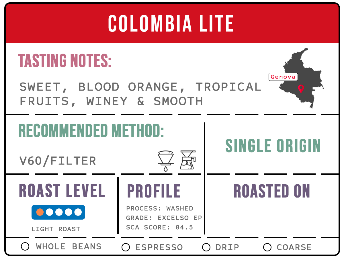 Colombia Lite is more than a light roast — it’s a celebration in a cup. Grown in the lush Genova region, this single-origin coffee captures the lively soul of Colombia with every pour. From the first sip, you're met with a bright citrus burst of blood orange, wrapped in the sweet, winey aroma of fermented fruit. As tropical notes unfold across your palate, a smooth and refreshing finish leaves you craving the next brew. Best enjoyed through V60 or filter brewing, this coffee is made for those who love complexity, clarity, and a fruity elegance that lingers.
