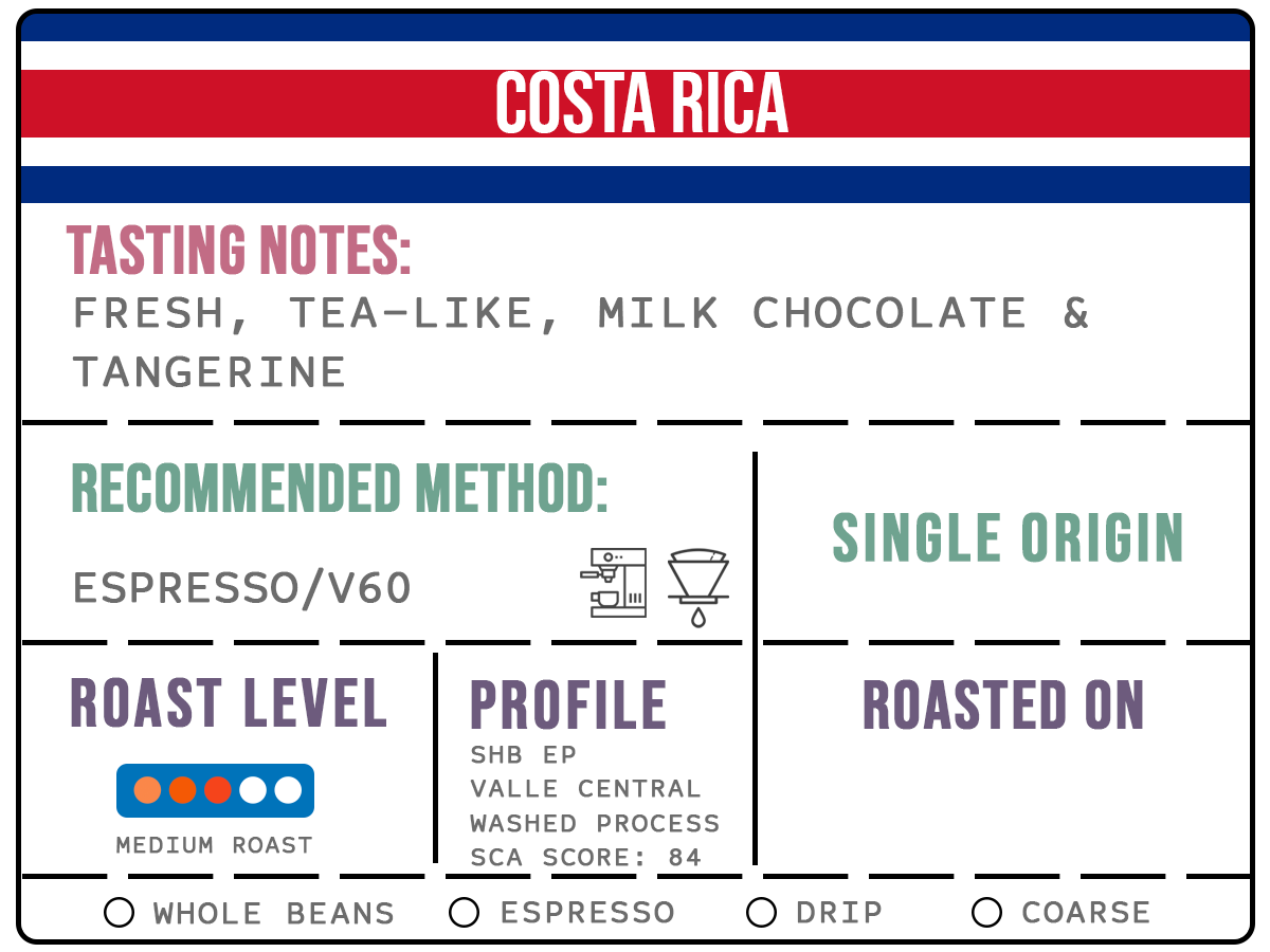 The Costa Rica single origin espresso and V60 medium roast, with an SCA score of 84, offers a vibrant and refreshing flavor profile. It begins with a fresh and tea-like quality, creating a light and delicate foundation. This is complemented by the smooth, comforting taste of milk chocolate, adding a layer of sweetness and richness. A bright tangerine note introduces a zesty citrus element, giving the coffee a lively, fruity finish. The medium roast enhances these flavors, providing a well-rounded cup that is both smooth and invigorating, ideal for those who appreciate a balanced coffee with a harmonious blend of freshness, chocolate, and citrus.