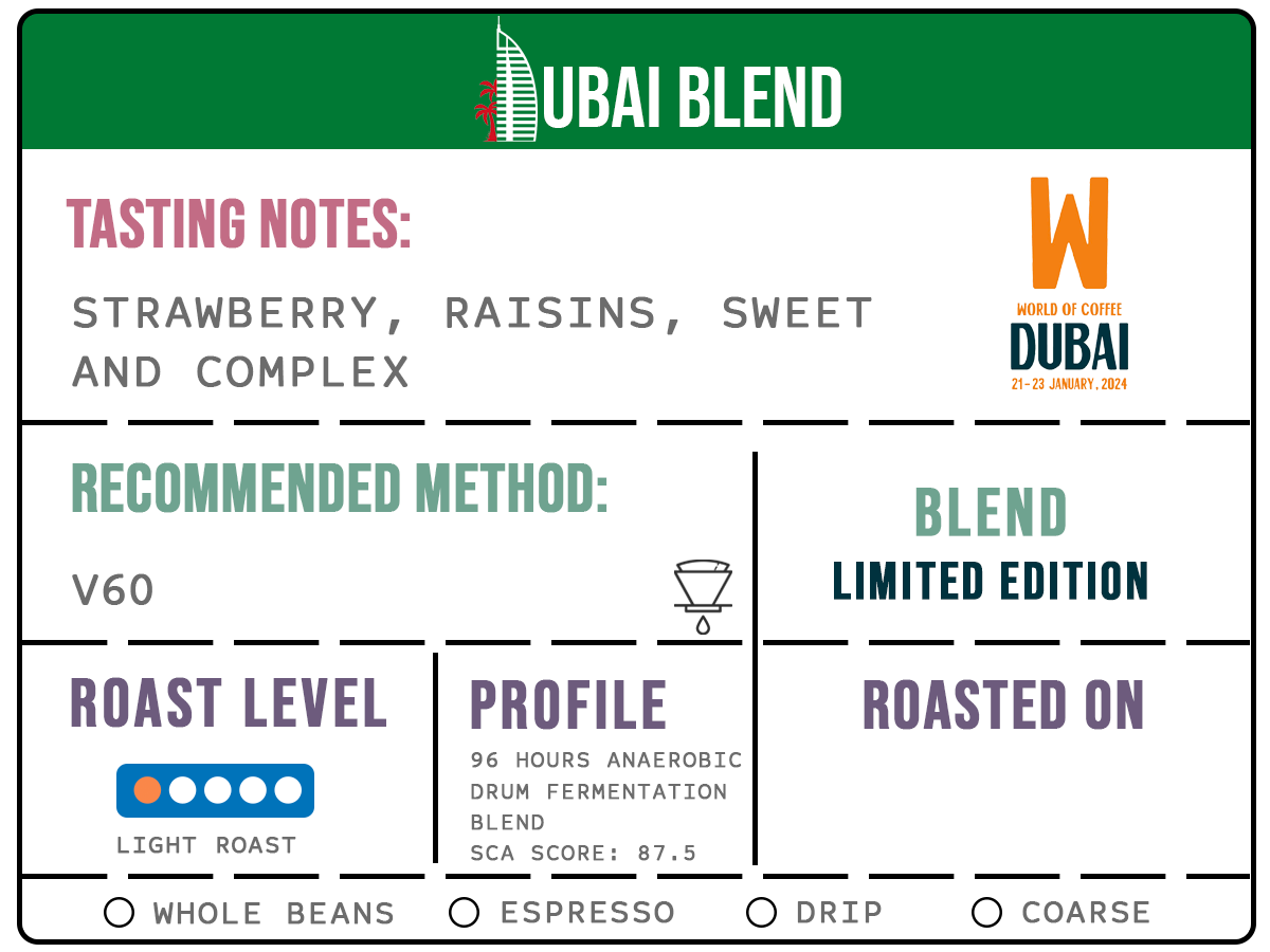 The Dubai Blend's 96-hour anaerobic drum fermentation and mild roast result in a very sweet and nuanced taste profile. It begins with vivid strawberry flavors, creating a luscious, fruity explosion that quickly captivates the palate. The coffee is enhanced by the deep, rich tastes of raisins, which provide a sense of natural sweetness and depth. The blend's richness is highlighted by its nuanced flavors and smooth, balanced finish. Brewed in a V60, this coffee has a refined, bright cup that is ideal for individuals who want an elaborate and fruit-forward mix with a hint of sweetness and a unique fermenting technique.