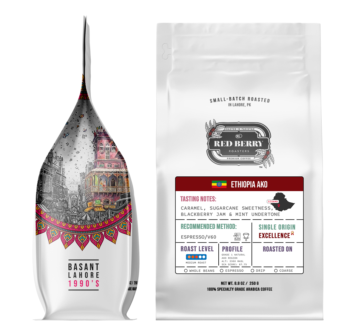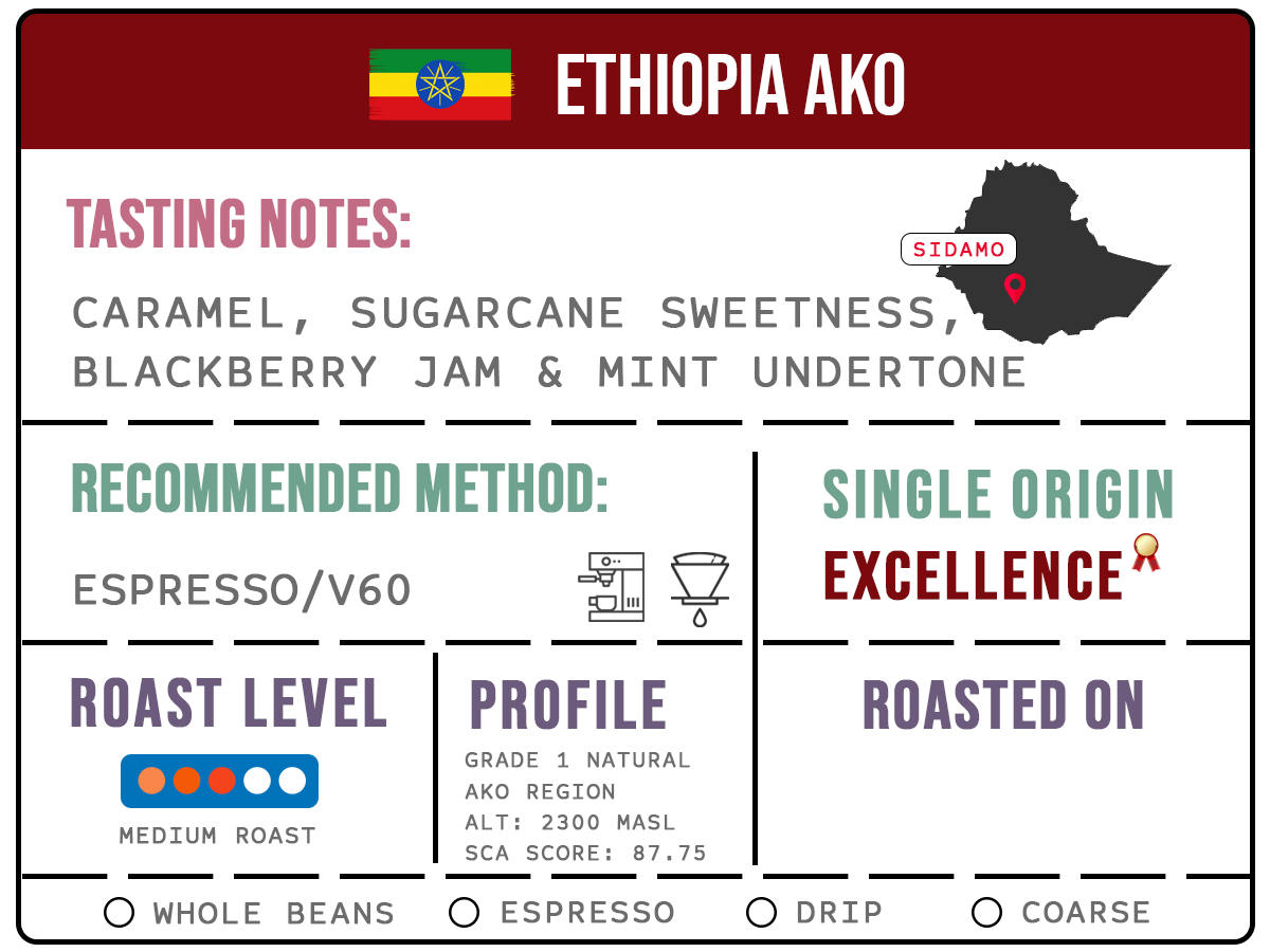 The Ethiopia AKO single origin excellence, medium roast, from the Grade 1 natural beans of the Ako region, with an SCA score of 87.75, offers a rich and complex flavor profile. It begins with the sweet, smooth taste of caramel, complemented by the sugarcane sweetness that adds a natural, molasses-like richness. As the coffee unfolds, blackberry jam brings a fruity, tangy depth that enhances the overall complexity. There’s also a refreshing mint undertone, adding a cool, herbal note that balances the sweetness and fruitiness. Brewed as espresso or V60, this coffee provides a well-rounded, layered cup with vibrant sweetness and a touch of herbal freshness, perfect for those who enjoy a dynamic and flavorful coffee experience.