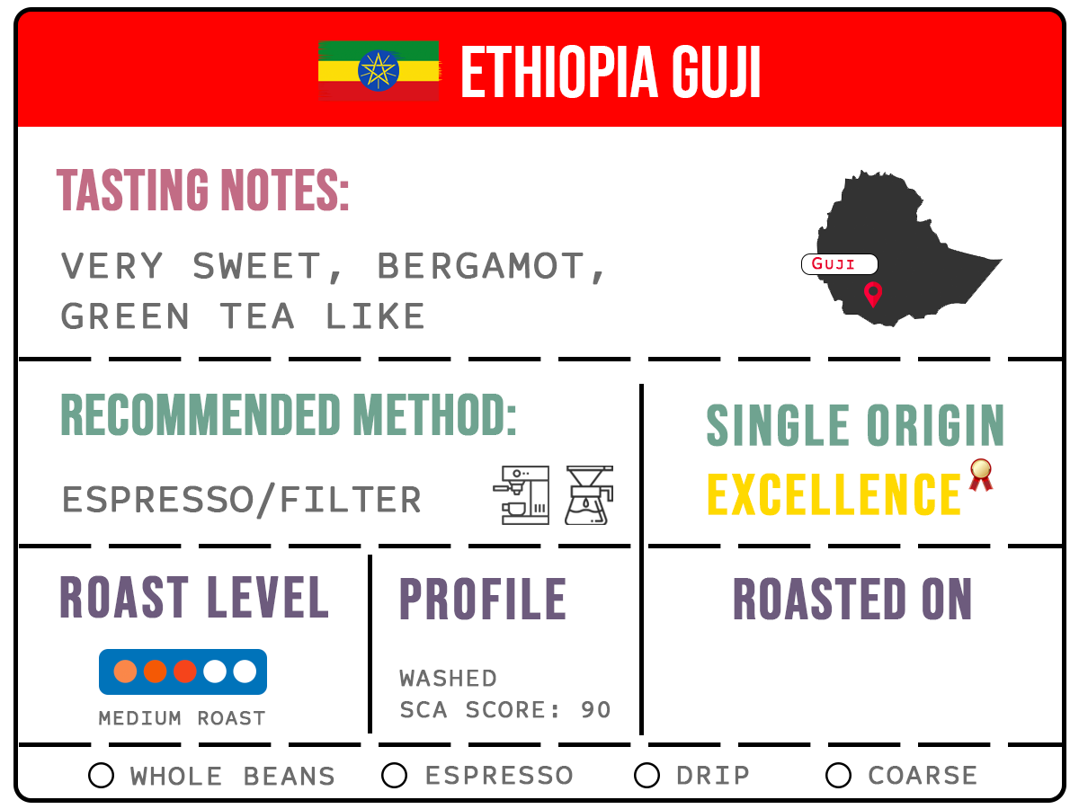 The Ethiopia Guji single origin excellence, medium roast, washed process, with an outstanding SCA score of 90, offers an exquisite and well-balanced flavor profile. It is very sweet, with a smooth, rich sweetness that provides a harmonious foundation. The coffee features prominent bergamot notes, which add a floral, citrusy element reminiscent of Earl Grey tea. Complementing the bergamot, there is a subtle green tea-like quality, giving the coffee a delicate, refreshing finish with a slight astringency. Whether brewed as espresso or filter, this coffee delivers a complex yet smooth cup, perfect for those who enjoy a bright, fragrant coffee with layers of floral and citrusy flavors.