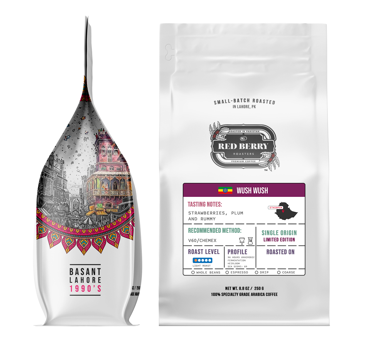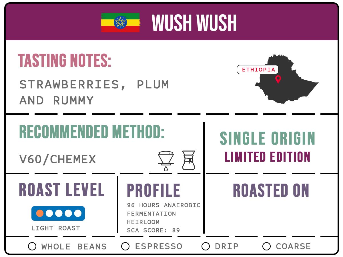 The Ethiopia Wush Wush single origin, light roast, with 96 hours of anaerobic fermentation, offers a truly unique and flavorful experience. This heirloom coffee, brewed as V60 or Chemex, boasts vibrant strawberry notes that provide a fresh, fruity sweetness. The plum flavor adds a juicy, slightly tart depth, enhancing the overall complexity of the cup. There’s also a distinctive rummy undertone, contributing a rich, fermented sweetness that ties the flavors together with a hint of warmth. With an impressive SCA score of 89, this coffee delivers a bold and layered cup that is perfect for those who appreciate experimental fermentation techniques and fruit-forward, complex flavors.