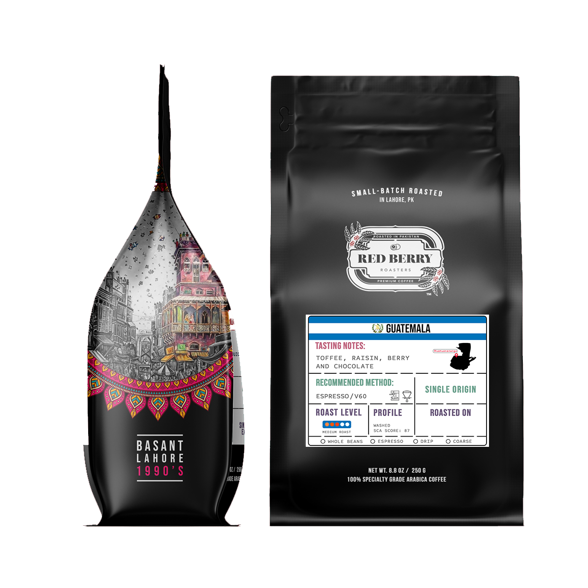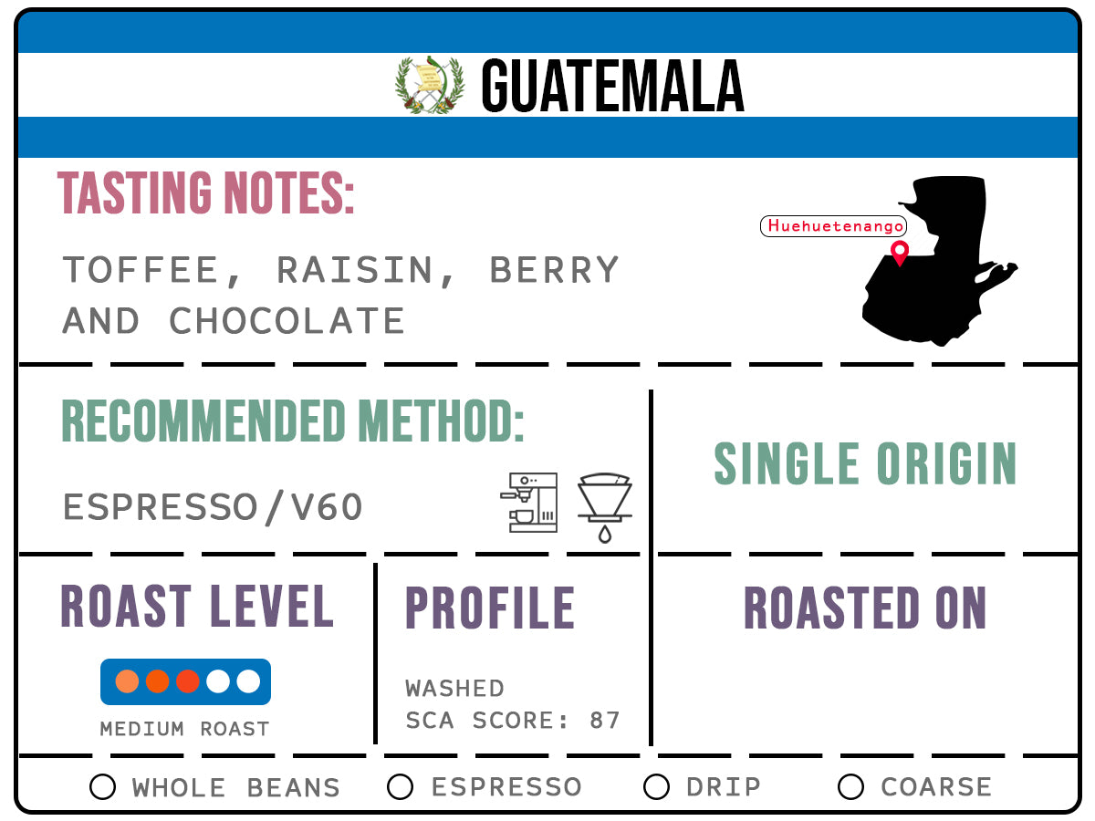 The Guatemala single origin, medium roast, washed process espresso/v60, with an SCA score of 87, offers a rich and well-rounded flavor profile. It begins with the smooth, sweet notes of toffee, which provide a caramelized richness, followed by the deep, fruity taste of raisin, adding complexity and depth. The coffee also features vibrant berry flavors, offering a burst of fruity freshness, while a subtle chocolate note ties everything together with a smooth, comforting finish. This medium roast delivers a balanced and flavorful cup, ideal for those who enjoy a harmonious blend of sweetness, fruitiness, and rich chocolate.