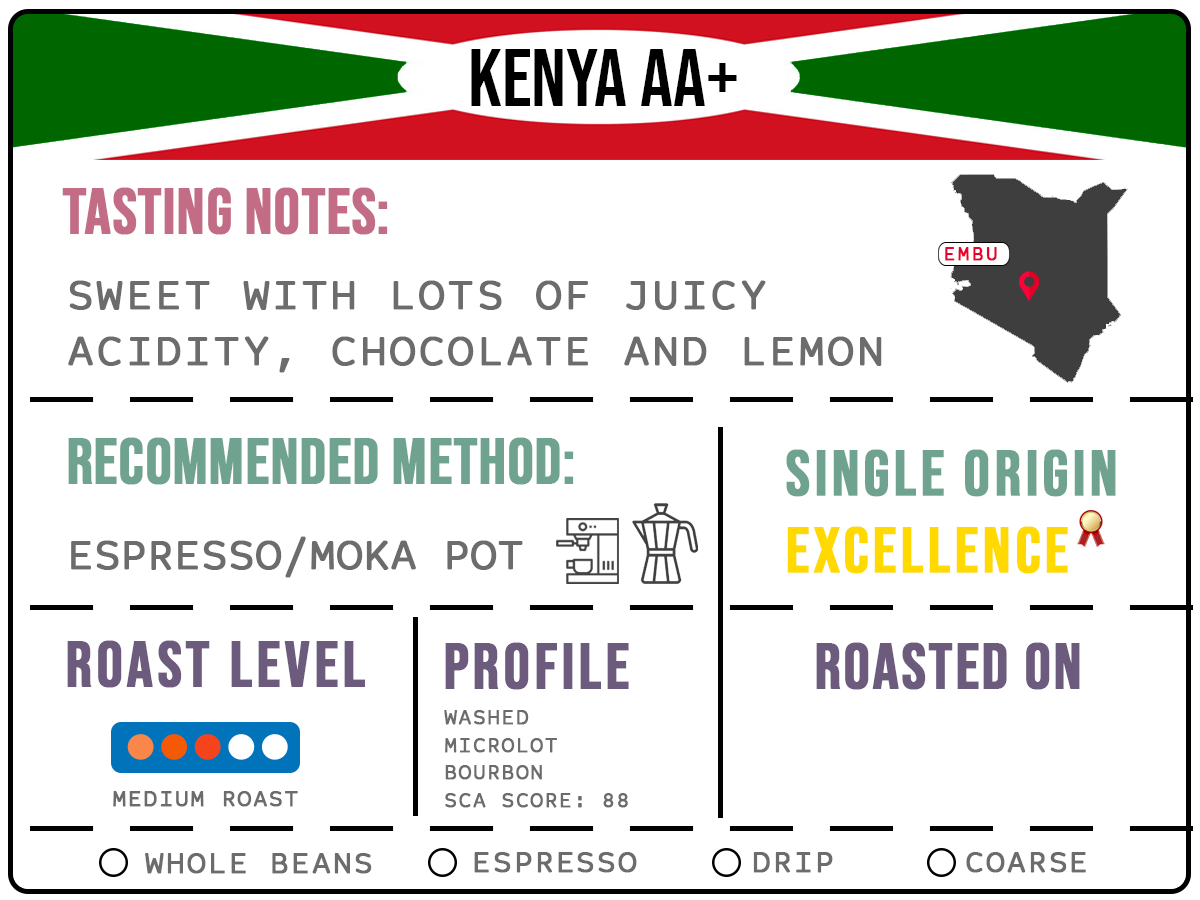 Kenya AA+", highlighting its unique tasting notes of sweetness, juicy acidity, chocolate, and lemon. The coffee is sourced from Embu, Kenya, and is characterized by a medium roast level. It is recommended for use in espresso or Moka pot brewing methods. The profile emphasizes washed micro-lot Bourbon beans, with a notable SCA score of 88, indicating excellence in quality.