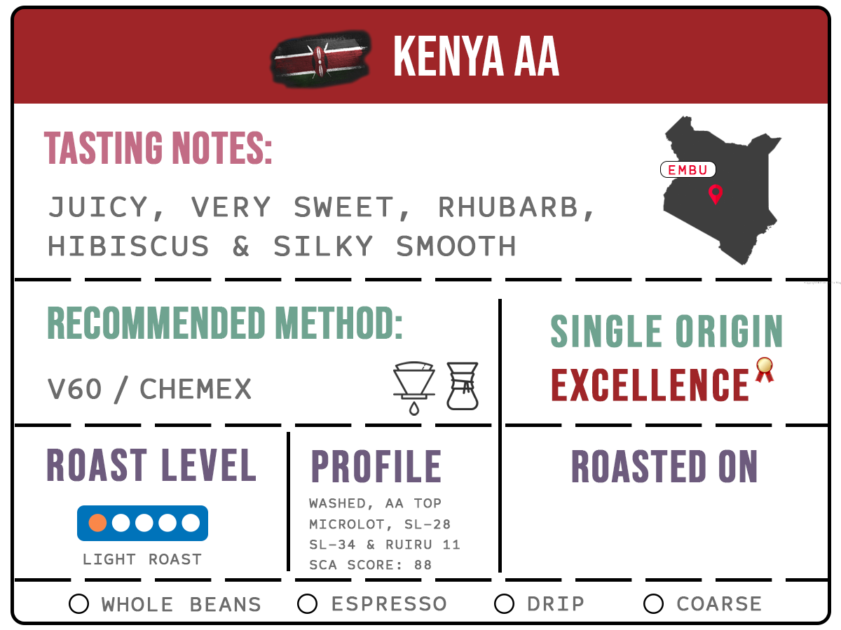 Elevate your coffee ritual with the Kenya AA – Light, a top-tier single origin microlot from Kenya's renowned highlands. Crafted from AA Top grade, washed process beans, this light roast showcases the refined complexity and brightness Kenya is celebrated for. With an exceptional SCA score of 88, each cup delivers a juicy and sweet experience, bursting with notes of rhubarb, hibiscus, and a beautifully silky-smooth finish.