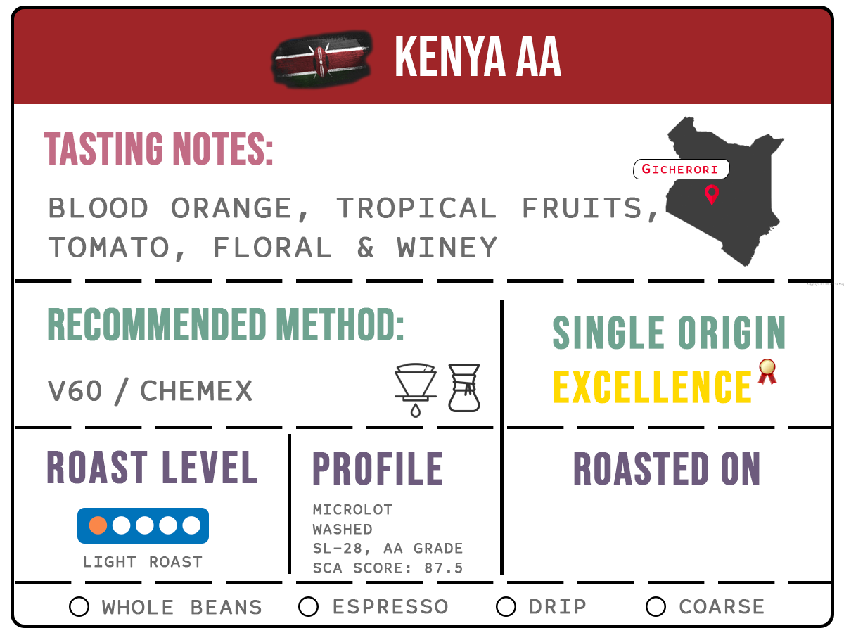 Kenya AA," featuring tasting notes of blood orange, tropical fruits, tomato, and floral winey characteristics. Sourced from Gicherori, Kenya, this coffee is identified as a light roast. It is recommended for brewing with V60 or Chemex methods. The profile highlights microlot washed beans with an AA grade, achieving a commendable SCA score of 87.5, which signifies its high quality