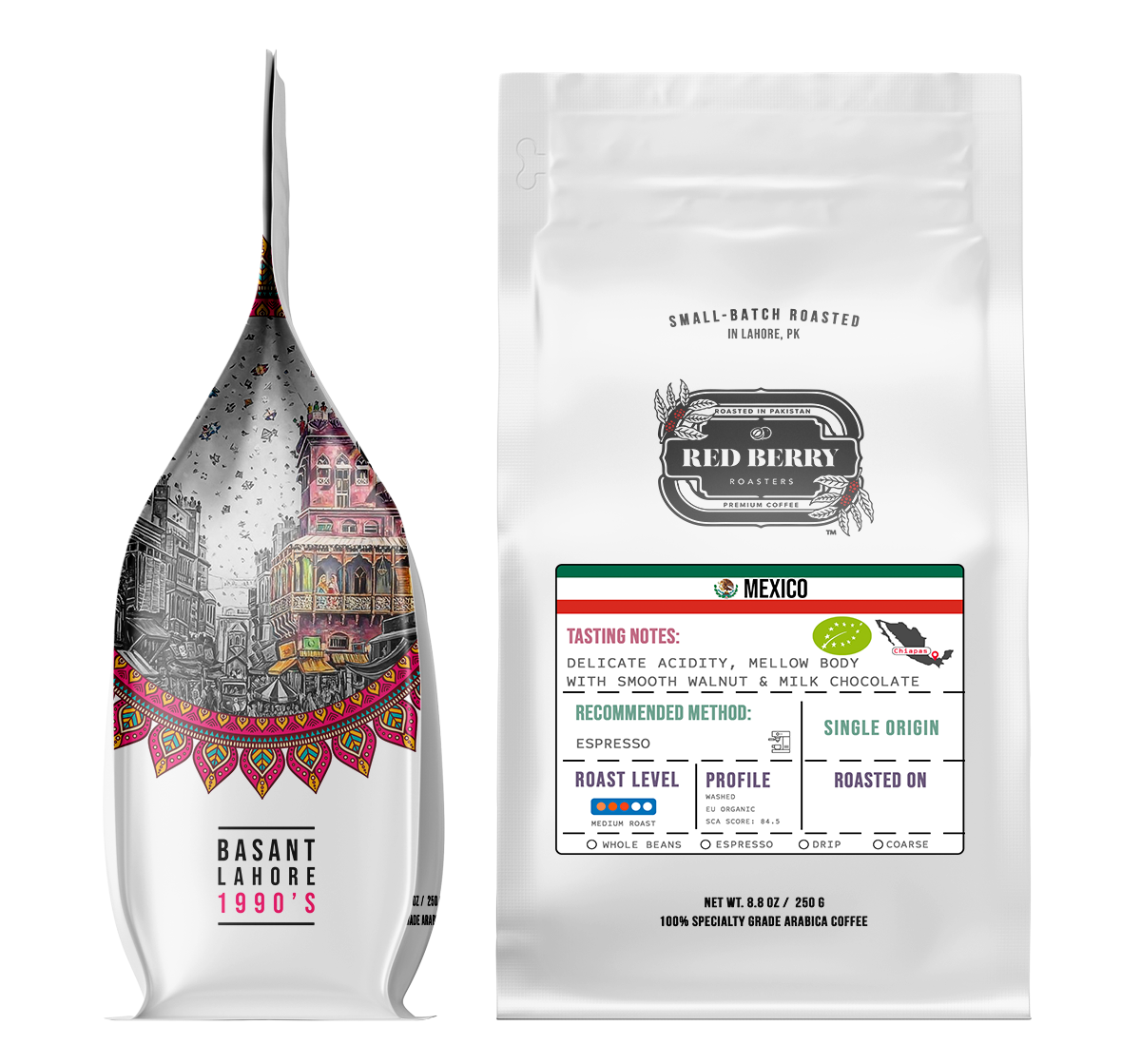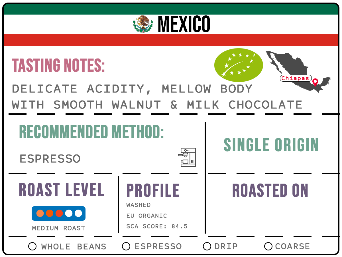 The Mexico single origin, medium roast, washed process EU organic espresso, with an SCA score of 84.5, offers a smooth and well-balanced flavor profile. It begins with a delicate acidity, providing a subtle brightness that refreshes the palate without overwhelming it. The coffee has a mellow body, offering a smooth, round mouthfeel that is both comforting and approachable. Notes of smooth walnut add a nutty richness, while the flavor of milk chocolate brings a sweet, creamy touch, making for a deliciously balanced cup. This espresso is perfect for those who enjoy a gentle, nutty, and chocolatey coffee with a smooth and mild finish.