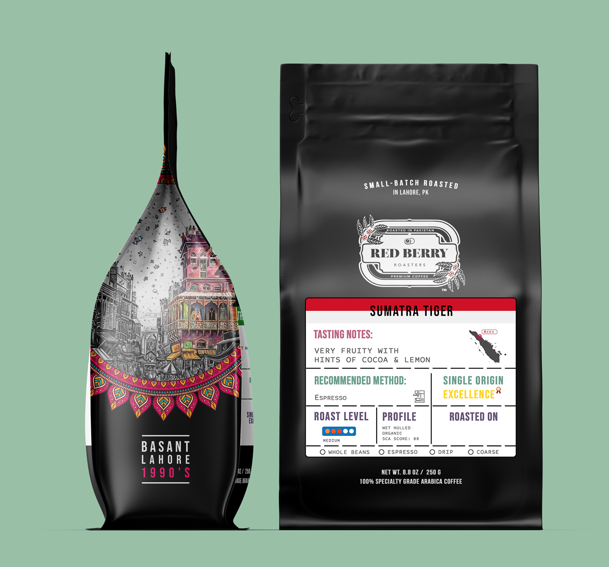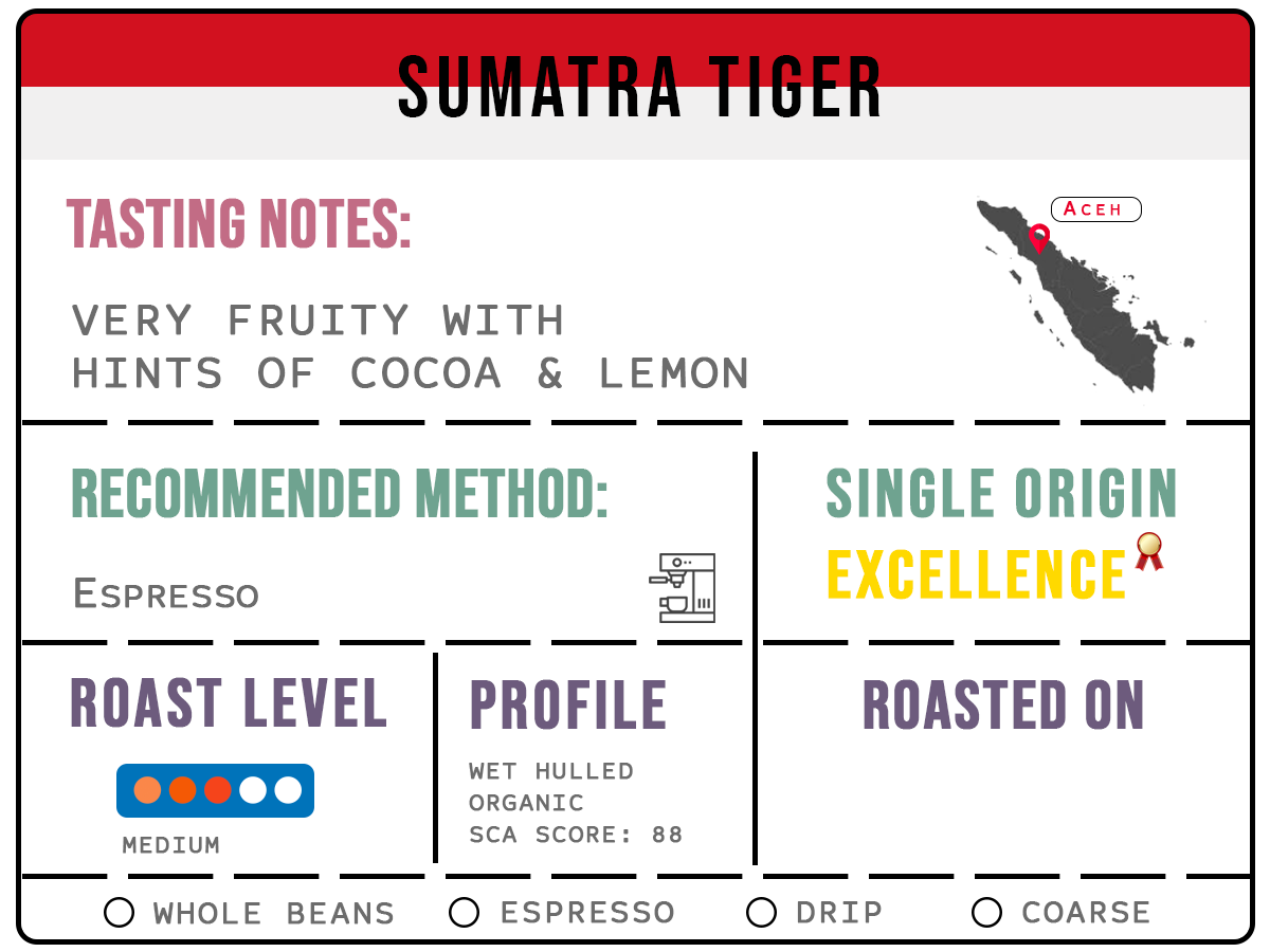 The Sumatra Tiger single origin excellence, medium roast, wet-hulled organic espresso, with an SCA score of 88, offers a dynamic and flavorful cup. It opens with a very fruity profile, bursting with vibrant, juicy flavors that provide a refreshing complexity. There are subtle hints of cocoa, which add a smooth, rich depth to the coffee. The addition of lemon brings a zesty, citrusy brightness that balances the fruitiness and enhances the overall flavor profile. This espresso is perfect for those who enjoy a medium-bodied coffee with lively fruit notes, a touch of cocoa, and a refreshing citrus twist.